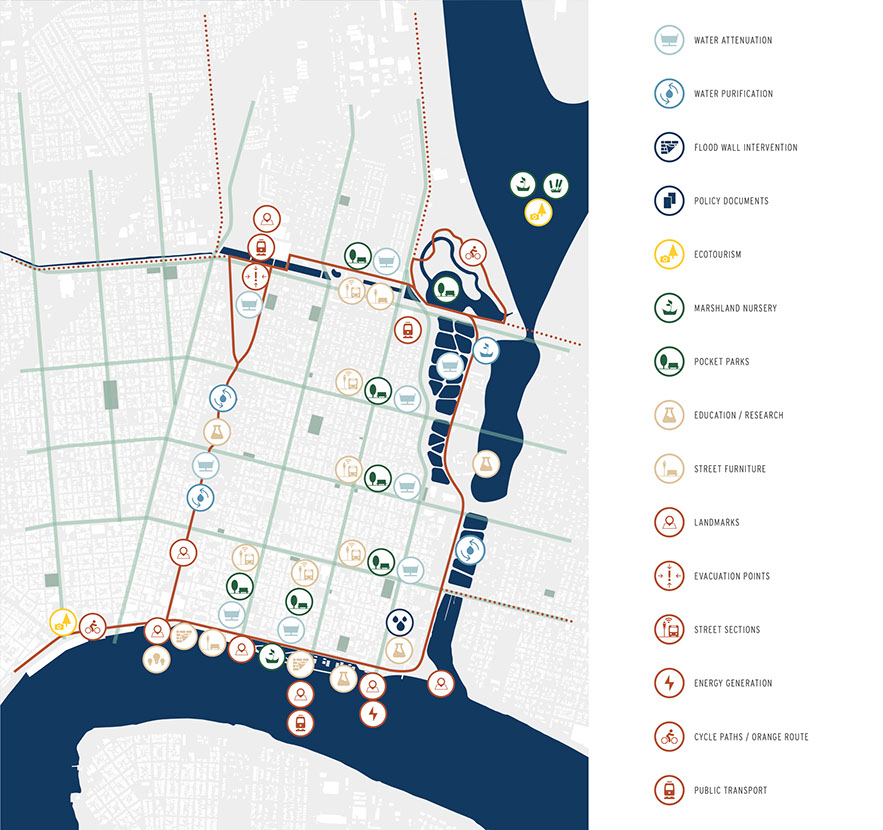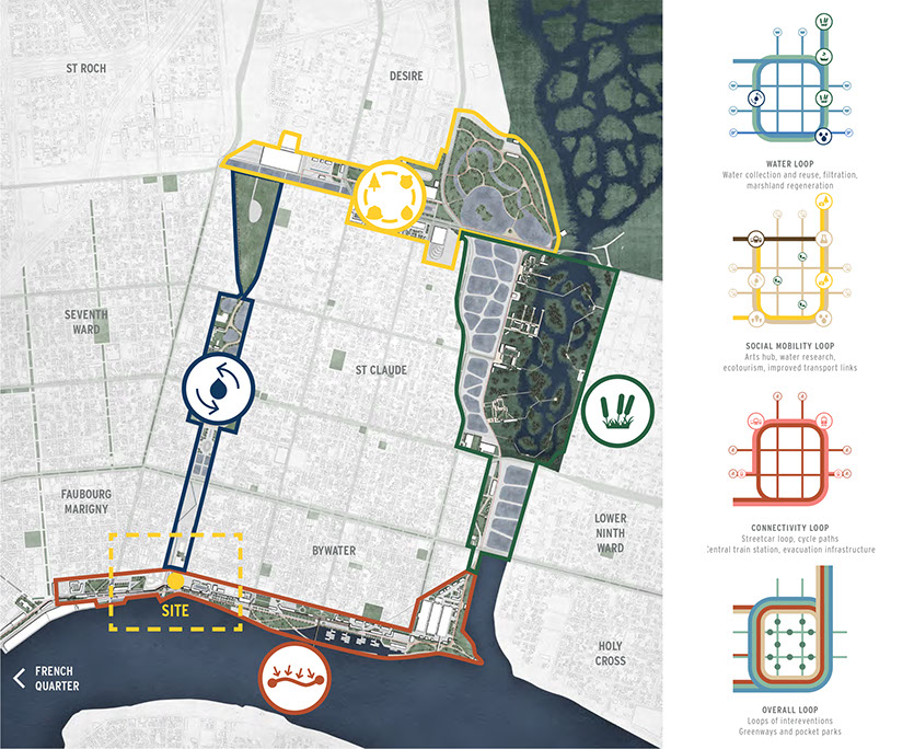Faced with issues of fear of water, social immobility and disconnection a series of toolkits of interventions were devised to form a masterplan in New Orleans. They are incorporated through means of an urban design proposal, generating four main spines and layers of greenways which provide green and blue infrastructure, improved connectivity between neighbourhoods and the wider city, as well as opportunities for employment and economic development. These form ‘loops’ of toolkits that are connected through various means, further enforcing ideas of connectivity and mobility. They work in hand with a series of macro-scale policy proposals which altogether aim to capture the full potential of these interventions, fostering the city