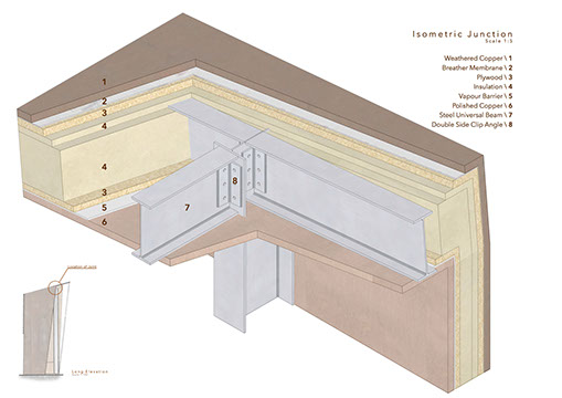 Copper and universal beam were assigned as the compulsory materials to use. The design of the kiosk is greatly based on the properties of these elements: intensive research was carried out to identify the optimal ways of using these materials.