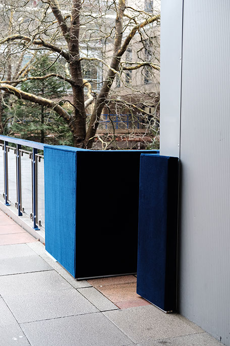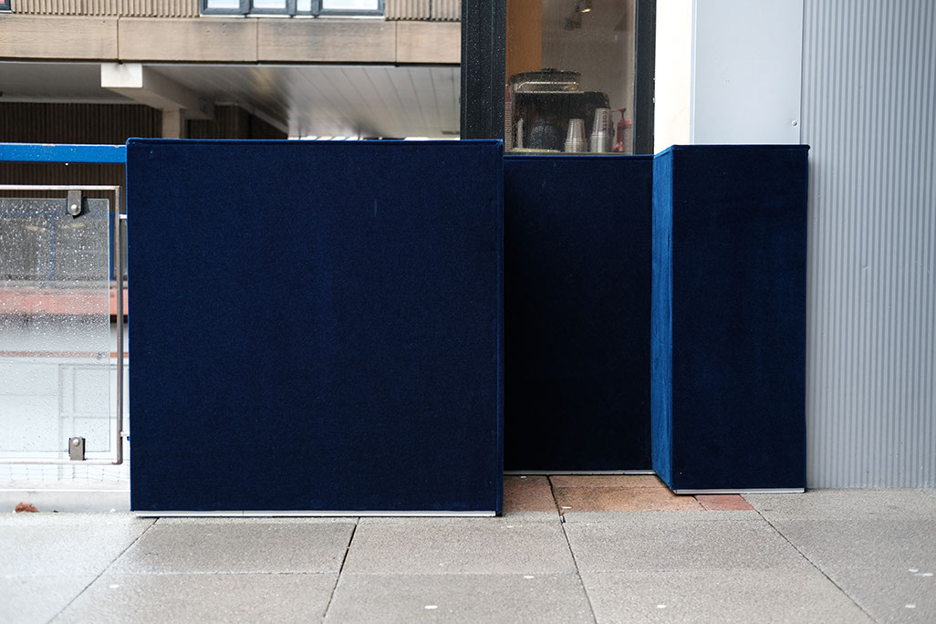 The inspiration for the installation came from a quiet corner in the middle of a busy road where we encountered someone stopping and making a private phone call. To highlight this, we were tasked to frame the site with minimum intervention, in order to signify the sense of privacy along a busy route. As a group, we decided to simply highlight the conditions of the site using fabric to create a comfortable area for phone conversations to continue in relative privacy and